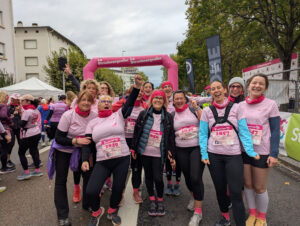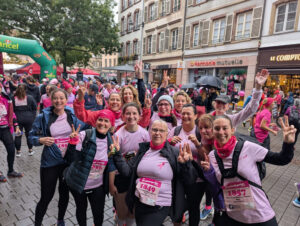 Valérie and Stéphanie engaged for breast cancer prevention. They are in company of colleagues of the university of Strasbourg